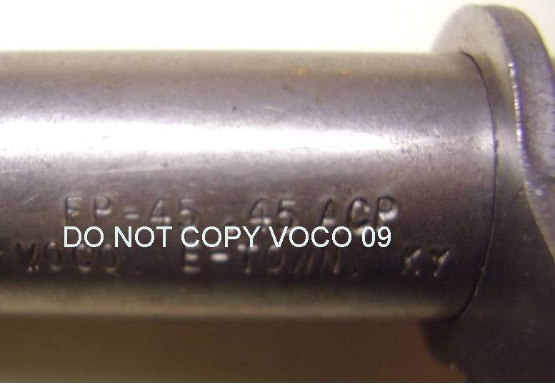 The original FP-45 is a clever and efficiently designed weapon but it has never received any accolades for operational safety. Once it is loaded, the only safe way to handle it is with the zinc cocking piece turned fully 90 degrees to the right or left so that the rear corner of the pistol’s grip frame will prevent it from rotating into firing position. If the cocking piece is re-aligned and the guide pin inserted through the hole in the cover slide as illustrated in the original instructions, THE PISTOL IS COCKED AND READY TO FIRE. IF DROPPED IN THIS STATE, IT COULD DISCHARGE CAUSING INJURY OR DEATH. Some worn original guns will have no mechanical means to hold the zinc cocking piece securely in the safe 90 degree position because the bottom of the firing pin boss is worn off from repetitive careless scrapping across the steel frame. There is no safe way to handle these pistols. A loaded pistol should never be un-cocked by lowering the zinc cocking piece when it is aligned in firing position. To do so would place the firing pin, under spring pressure, directly on top of the primer of the chambered cartridge. IF THE PISTOL WAS JARRED OR DROPPED IT IS HIGHLY LIKELY TO DISCHARGE.