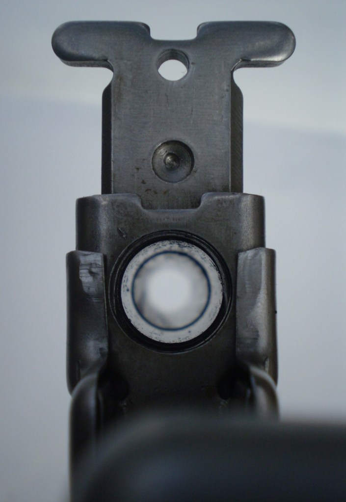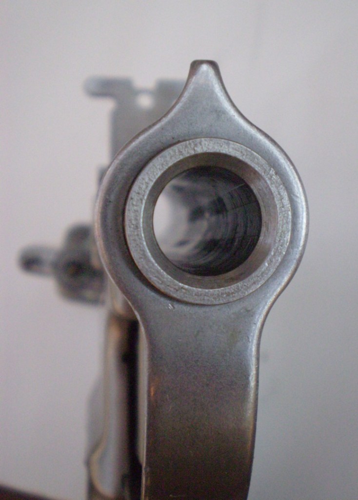True to original reports, the Model 1 firing pin did sometimes miss the hole. You can actually see the dent in the cover slide of our sample gun. It seems so obvious that one wonders how three really smart people like Hyde, Everitt and Hamisch didn’t plan for some type of guide pin to keep the cocking piece properly oriented right at the start.