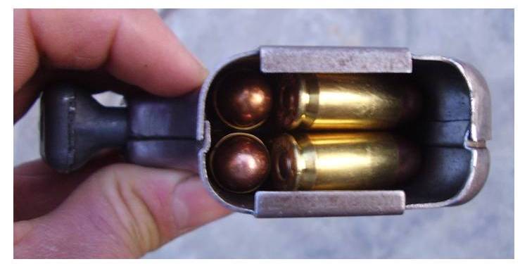The next two cartridges are dropped into the gap at the back of the compartment primer down.