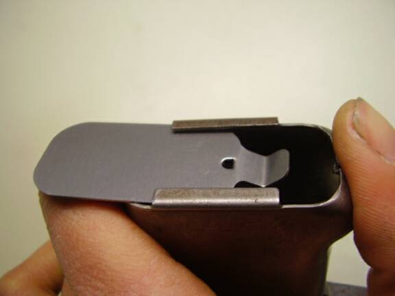 Many surviving FP-45 Liberators are missing the snap cover that caps off the ammunition storage compartment in the grip frame. (Because of this we made some extra ones.) Part of the problem lay in the material they are made of. The plans called for half-hard tempered material. They were not springs. You bent them into place and bent them open. This is why many of the ones that survive are really bent up. If you don’t bend the tab over the front of the grip enough, it could easily get knocked off. To minimize the bending and preserve the integrity of the snap cover, push it straight backward in its channel as the illustrations in the original instructions show. It does not take much force to push the little bent tab rearward away from the hump. The metal will flex enough to slide right over it and still retain enough elasticity to stay in position when you slide it back on. Do not pull the tab downward, away from the butt, and slide it forward in an attempt to get the tiny stamped out retaining tongue behind the tab over the front hump of the grip frame. This puts a great deal of bending stress on the tab and the middle of the part, bending the former up badly and the latter like a banana. The result is a once beautiful part is now deformed and ugly and won’t stay on anymore. At least when it falls off and gets lost you won’t have to endure the hideous sight of it anymore. If you mess it up we do have extras.