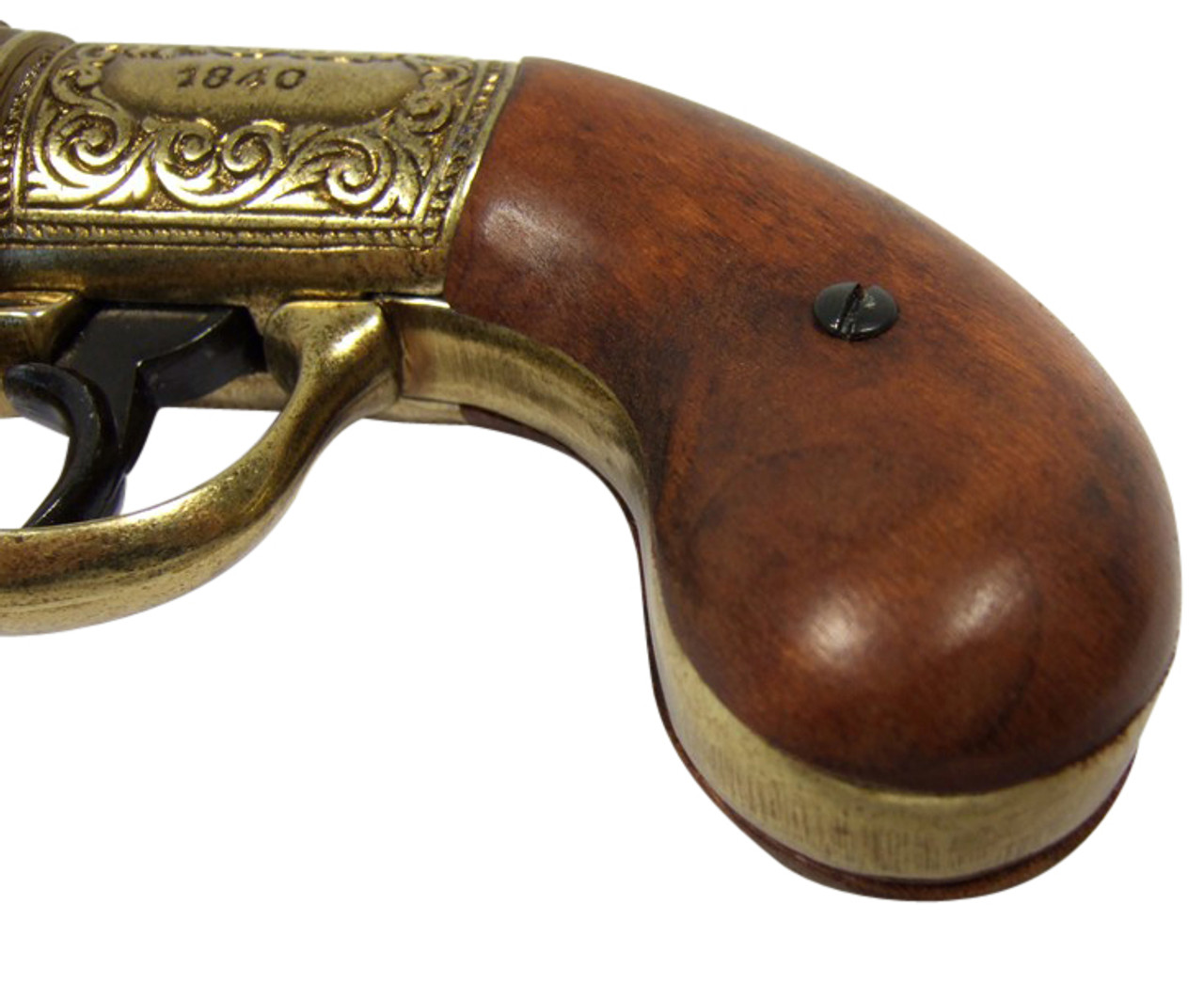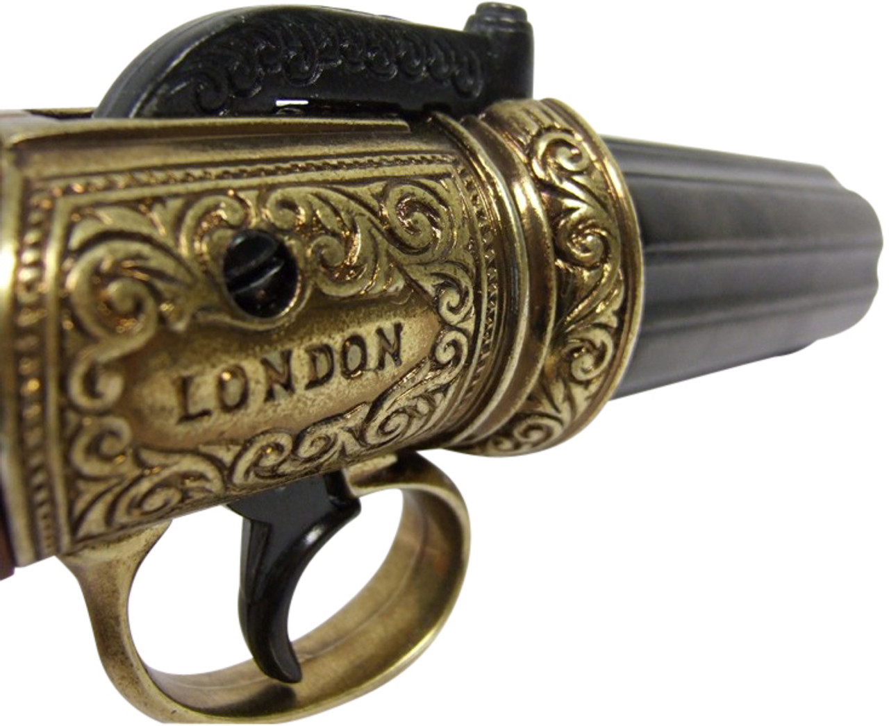 This unique percussion cap revolver was developed in London circa 1840. It features 6 revolving barrels, and is stamped “London” and has wood grips.
