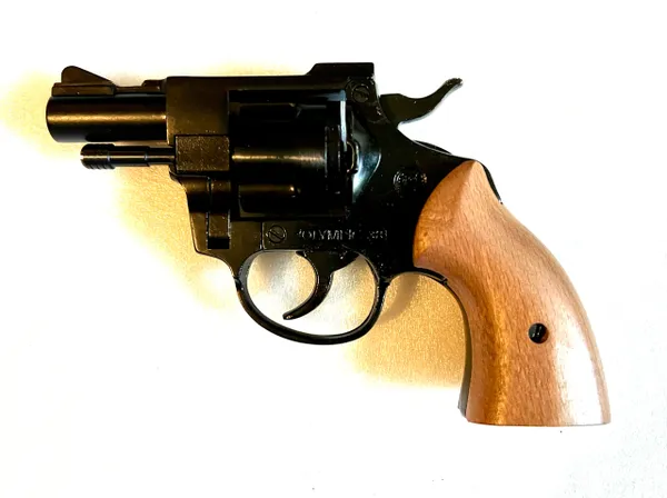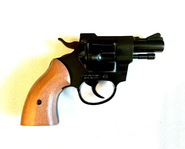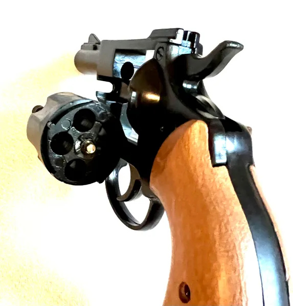 This replica .357 style snub nose blank firing revolver made by Bruni has working single and double action and a swing-out cylinder that holds five 9mm (.380) blanks. This blank gun comes assembled in either a blued or nickel finish with wood grips.