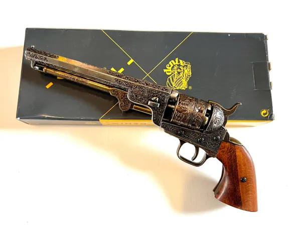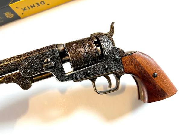 This famous civil war revolver was used extensively throughout the War Between the States by both Union and Confederate troops. It’s 7.5″ octagonal barrel and strong frame made for a reliable, handsome sidearm. The barrel and frame of this replica gun feature elegant scroll engraving while the cylinder is engraved with tall sailing ships. This model gun features realistic looking replica ivory grips.