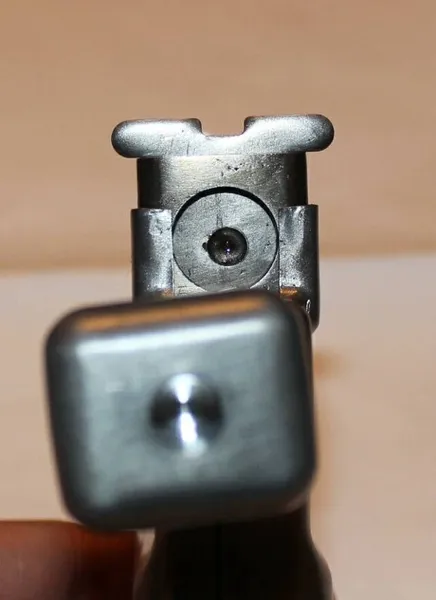 True to original reports, the Model 1 firing pin did sometimes miss the hole. You can actually see the dent in the cover slide of our sample gun. It seems so obvious that one wonders how three really smart people like Hyde, Everitt and Hamisch didn’t plan for some type of guide pin to keep the cocking piece properly oriented right at the start.