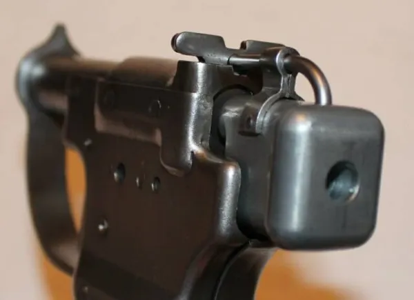 The original FP-45 is a clever and efficiently designed weapon but it has never received any accolades for operational safety. Once it is loaded, the only safe way to handle it is with the zinc cocking piece turned fully 90 degrees to the right or left so that the rear corner of the pistol’s grip frame will prevent it from rotating into firing position. If the cocking piece is re-aligned and the guide pin inserted through the hole in the cover slide as illustrated in the original instructions, THE PISTOL IS COCKED AND READY TO FIRE. IF DROPPED IN THIS STATE, IT COULD DISCHARGE CAUSING INJURY OR DEATH. Some worn original guns will have no mechanical means to hold the zinc cocking piece securely in the safe 90 degree position because the bottom of the firing pin boss is worn off from repetitive careless scrapping across the steel frame. There is no safe way to handle these pistols. A loaded pistol should never be un-cocked by lowering the zinc cocking piece when it is aligned in firing position. To do so would place the firing pin, under spring pressure, directly on top of the primer of the chambered cartridge. IF THE PISTOL WAS JARRED OR DROPPED IT IS HIGHLY LIKELY TO DISCHARGE.