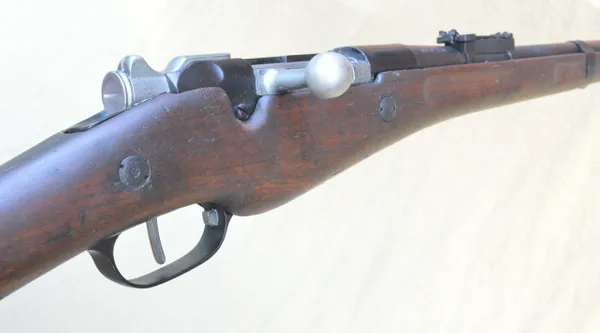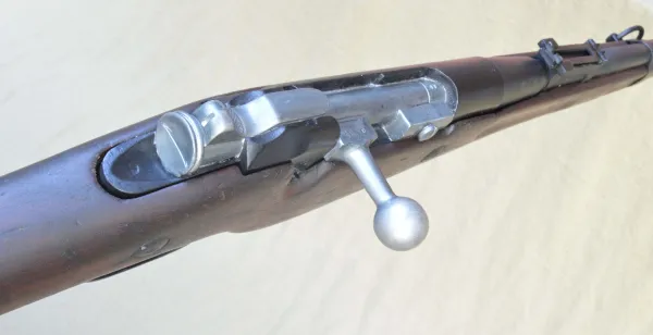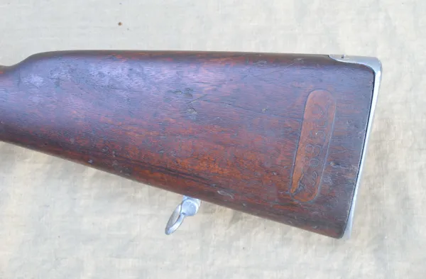 Our museum grade reproduction is light weight so it can be more easily mounted in your exhibits. Overall weight of the replica is only 2 lbs. 13.5 oz. / 1.29 kg . The “metal” parts are made of durable resin plastic from molds cast from a real rifle. The buttplate, butt sling swivel, barreled action, triggerguard, stock bolts and bands are all separately cast parts. We use a slightly flexible plastic to reduce the chance of breakage if the piece is dropped. The round ring for the sling on the middle band is made of metal so a sling can be mounted for exhibit purposes. The wooden stock is actually an original century old (World War One vintage) stock, complete with dents, dings and scrapes. Restoring the original stocks is very time consuming and labor intensive. In addition , our supply of original stocks is very limited.