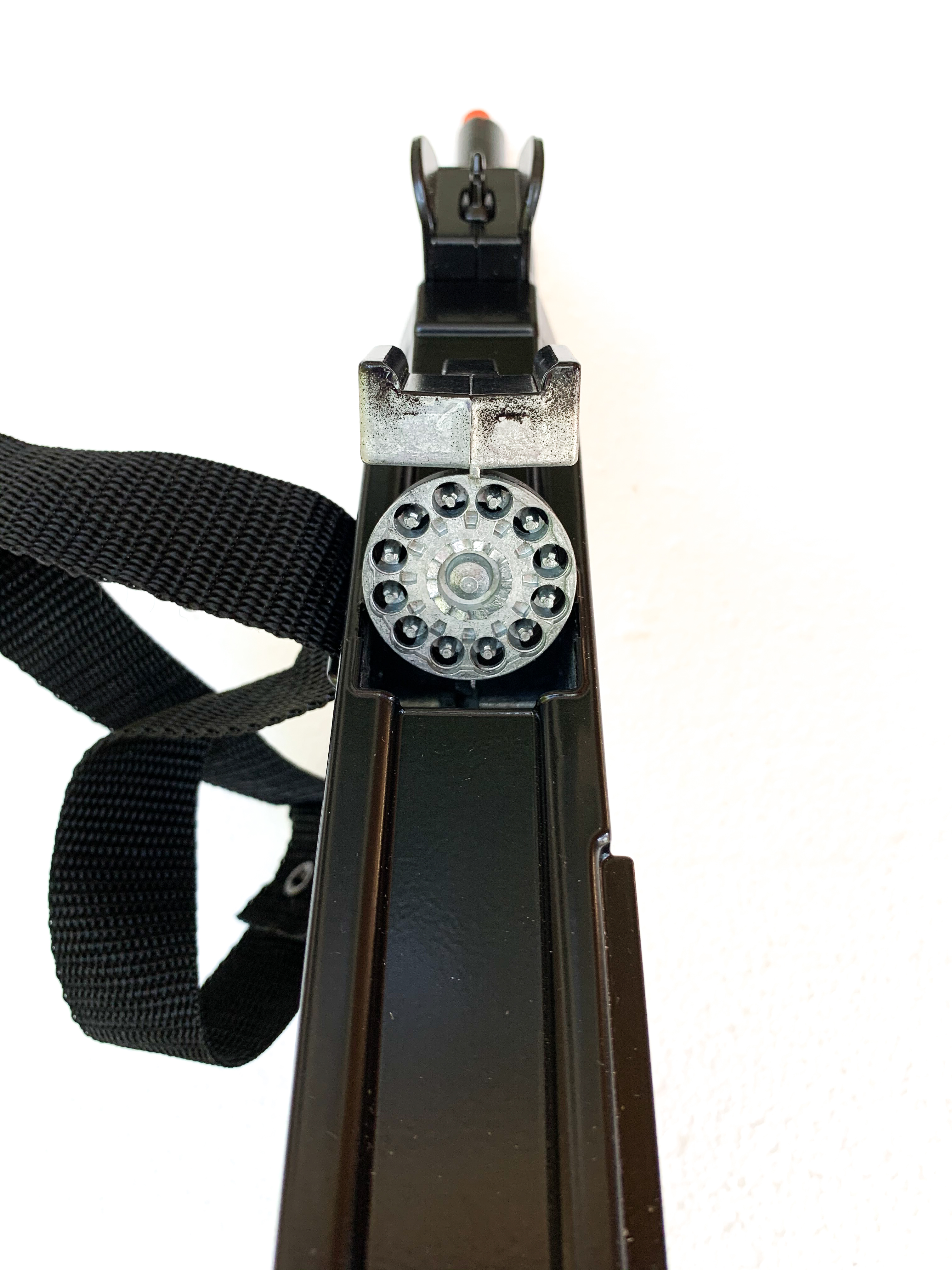 This cap firing die cast metal model IS LIFE SIZE measuring 18.5” It is made by Gonher in Spain. Gohner has a reputation for making the highest quality cap guns in the toy industry. The 12 shot ring cap mechanism is ingeniously hidden inside and pops up for loading when the lever is pressed. It will shoot as fast as the trigger can be pulled. Includes black sling. The replica looks good enough to be used in theatrical work.