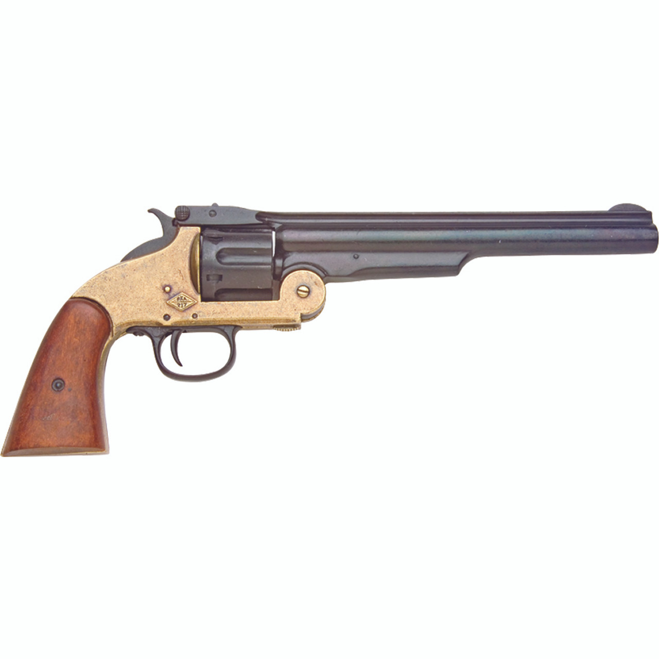 The M1869 .45 caliber Schofield Single Action Old West Pistol was a favorite of the U.S. Cavalry, stagecoach agents and Frank James. This replica gun is a frontier classic that features an 8″ barrel and two tone finish – blued with brass trim. Its unique break-open action makes for easy reloading. It was also favored by the Czar for Russian troops. Wyatt Earp is said to have carried a similar version of the historic replica.