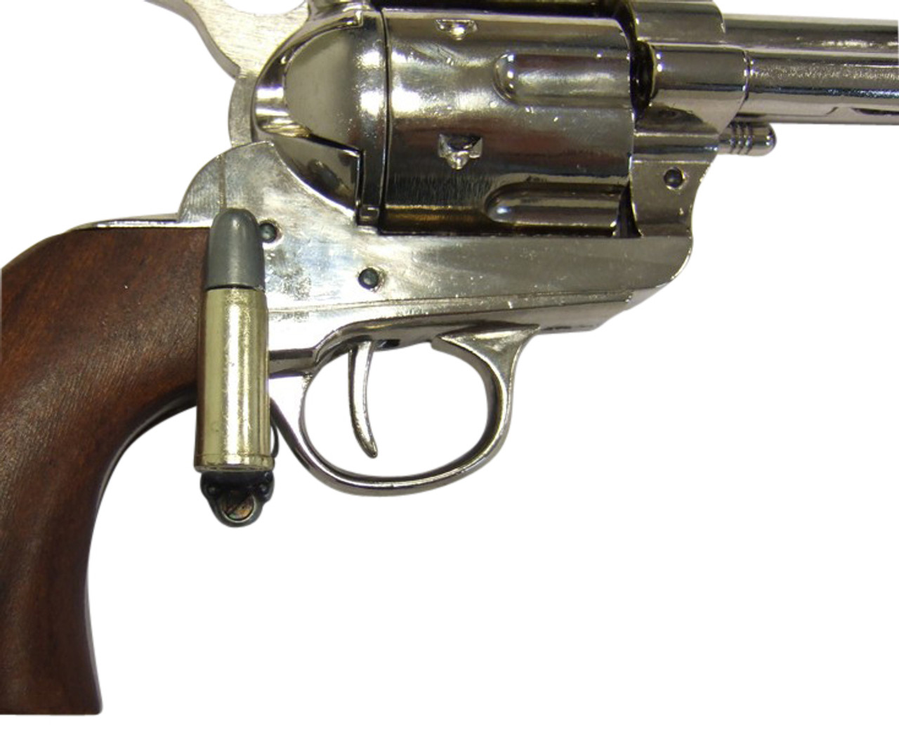 Denix M1873 45 Fast Draw Revolver Replica – Can shoot caps Introducing the cap firing M1873 45 Peacemaker Revolver – The Old West lives Again and you have the best cap gun in the world to show for it! This solid metal cap gun looks and feels like the real thing. A replica of a single action fast draw model, this cap gun features a 4.75″ barrel, new wood grips, working single action and shell ejector. Not only does this cap gun fire off 6 rounds of caps seamlessly, the version is accurately detailed and shows typical craftsmanship. Makes a great costume or conversation piece. How it works. Pull off 1 cap from ring and push into the center of adapter dummy shell. Repeat for all 6 adapter cap shells. Load each dummy cap shell into cap gun cylinder. Pull the hammer back and pull the trigger. Please note this is a single action revolver so the hammer needs to be cocked back each time to move the cylinder and fire. Features: Comes with 6 Adapter Dummy Cap Shells Authentic size and weight of actual gun Old West Cap guns has working mechanism Old West Cap guns makes a super prop gun Old West Cap guns are a great costume accessory for that cowboy! Made of quality wood and metal Makes a unique decorator item and conversation piece Does NOT include caps Specifications: Length: 10.5″ Blued (black) finish 4.75″ Barrel Wood Grips ** If you do NOT want the adapter / dummy shells you can purchase Model no.: 22-1186B Warning: Cap Guns are not toys and she be treated like a real gun. Never point at any person and keep arm full extended when firing. Use under adult supervision. Must be 18 years to purchase.