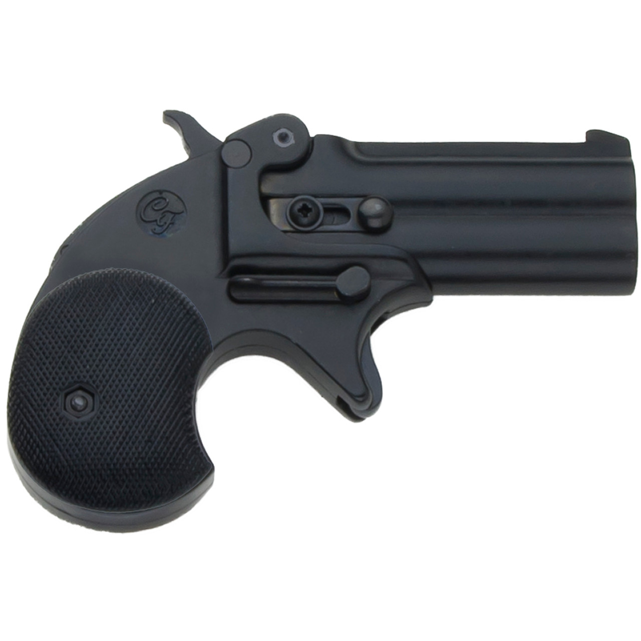 This M1866, .22 CALIBER DOUBLE BARREL DERRINGER, was a favorite hideaway gun of outlaws and gamblers. It has an authentic, working action, and swing locking lever. The barrels swing up for easy loading. Cam action allows hammer to strike first one barrel then the other. This model comes with black plastic grips.