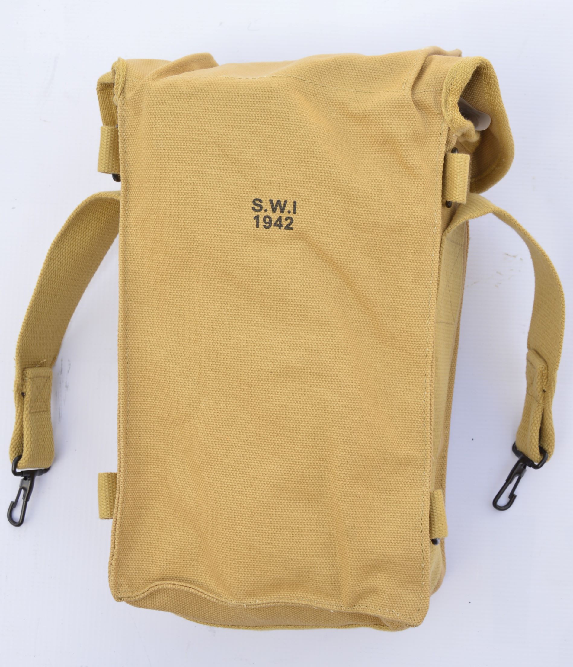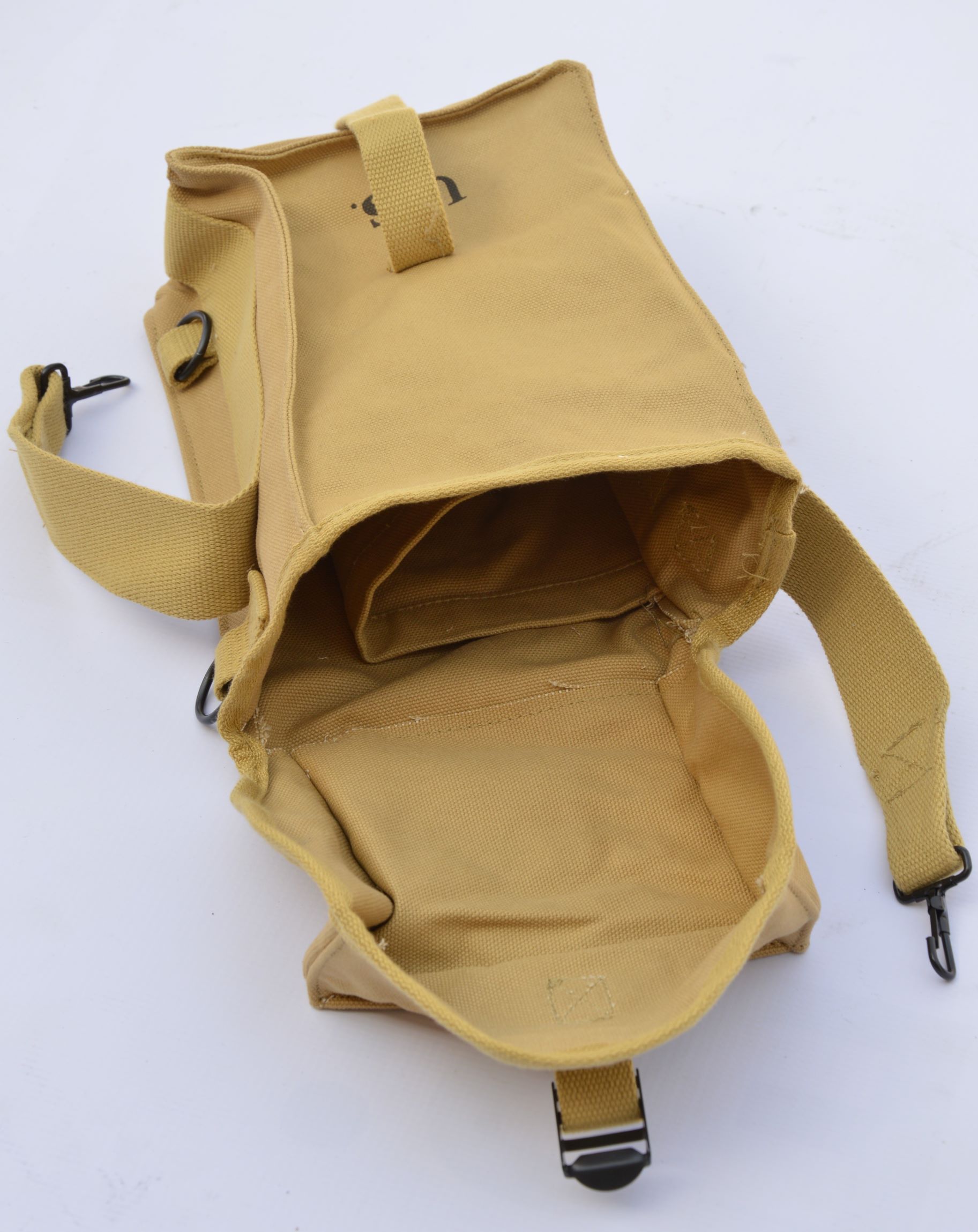 This general purpose rectangular bag was designed to carry all kinds of ammunition: machine gun belts, Thompson SMG magazines, rifle grenades, EN-bloc clips, etc., etc. It could be clipped to the soldier’s web belt or attached to a standard carrying strap. Obviously, since they could hold just about anything, they were used to carry just about anything. These are frequently seen clipped the footman’s loops on combat vehicles. .