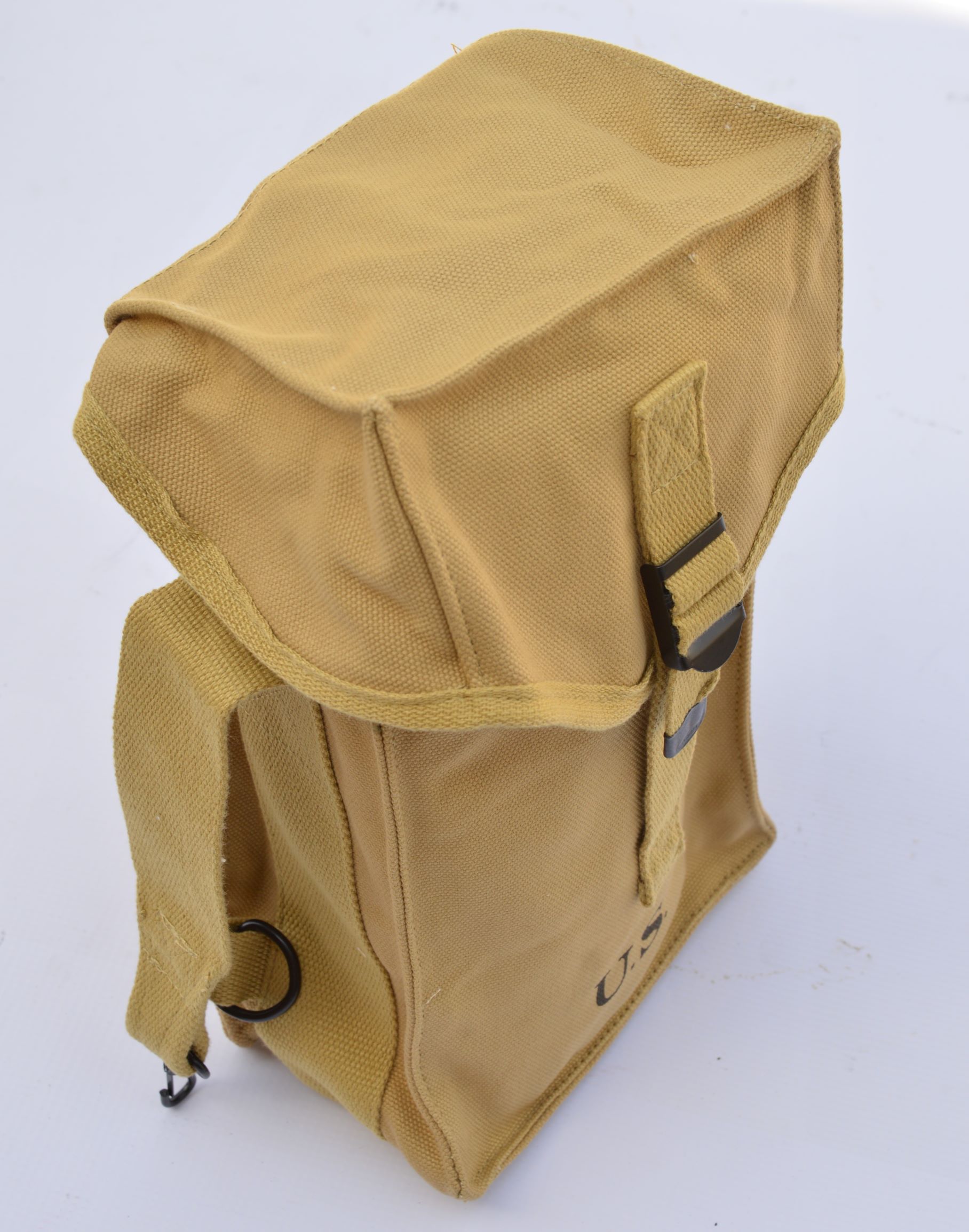 WWII US Army Ammunition Carrying Bag Reproduction This general purpose rectangular bag was designed to carry all kinds of ammunition: machine gun belts, Thompson SMG magazines, rifle grenades, EN-bloc clips, etc., etc. It could be clipped to the soldier’s web belt or attached to a standard carrying strap. Obviously, since they could hold just about…