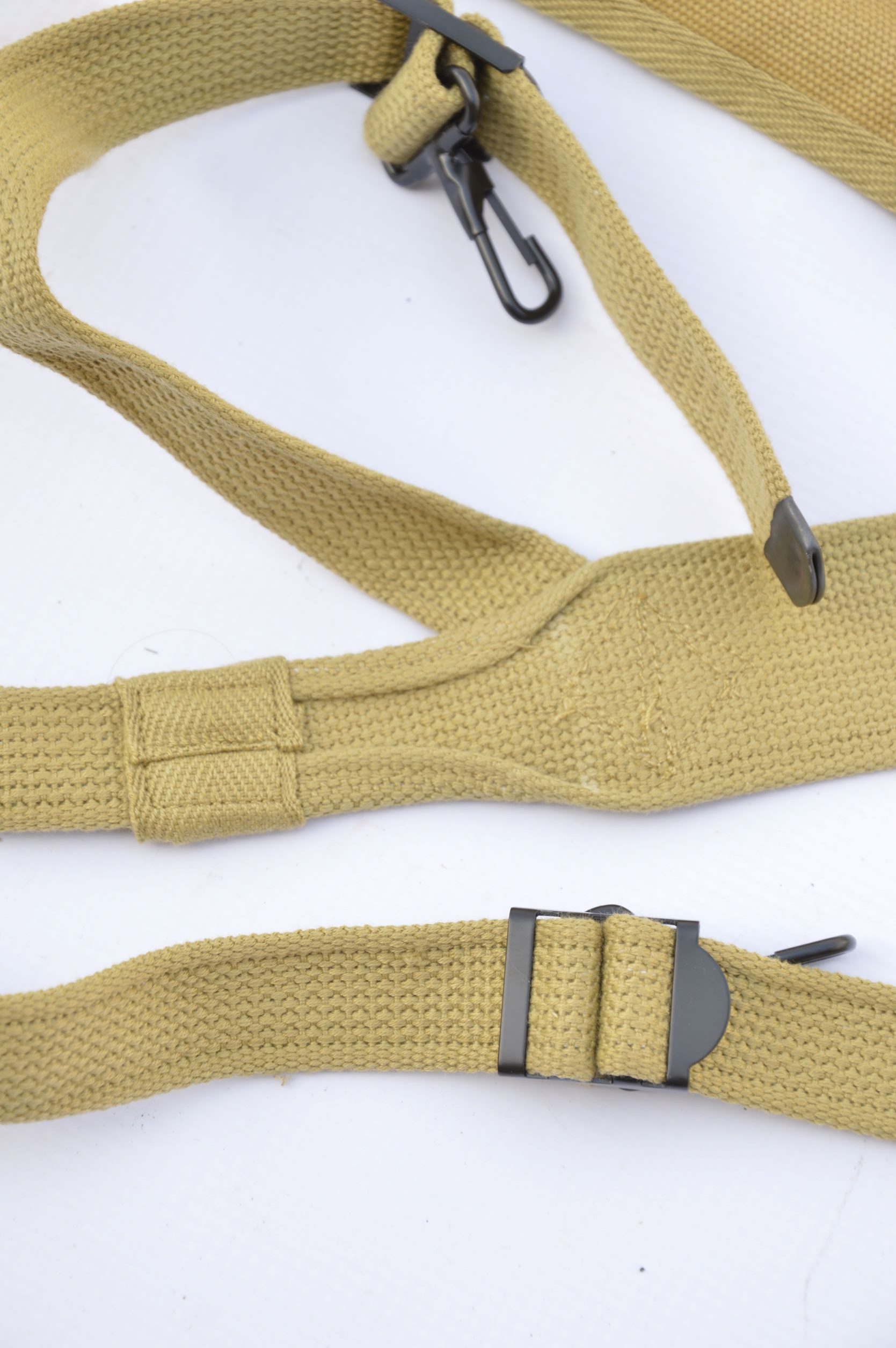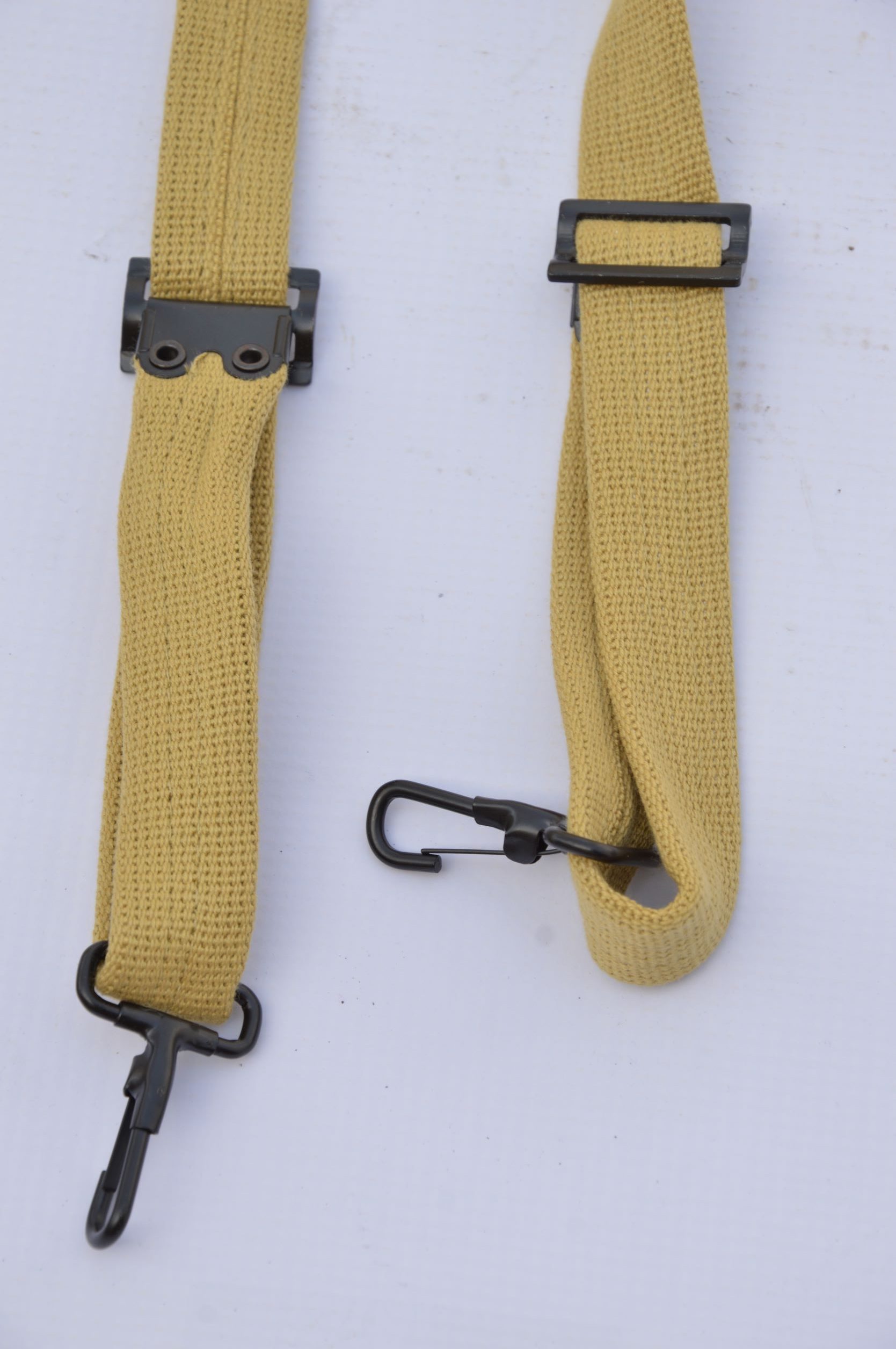 These combat suspenders were designed for use with the M1936 Musette Bag and have the same functionality as the suspenders incorporated into the M1928 Haversack. The supporting straps are adjustable for the soldier’s height and have clips on the ends for attaching them to the web belt and the bottom D rings of the haversack.