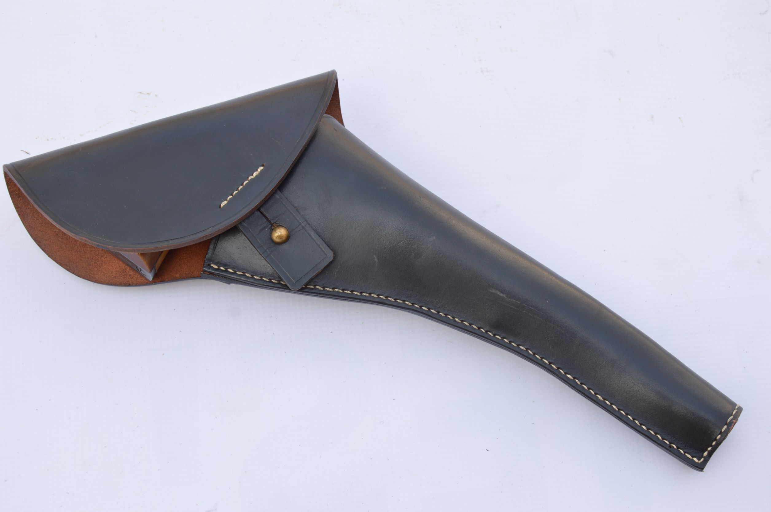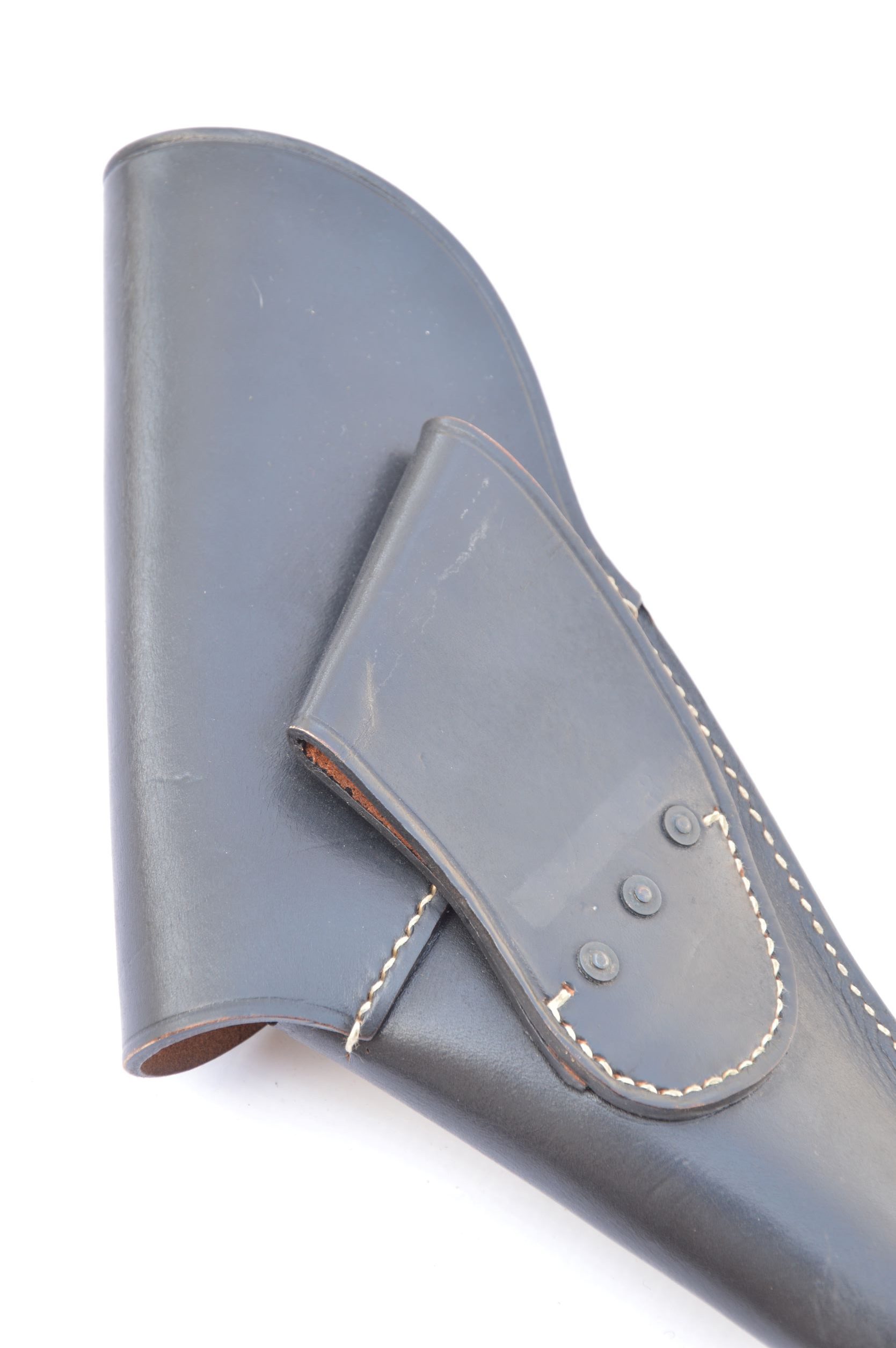 This well made holster is styled like a standard issue U.S. Army right side holster, but designed for the butt to be worn rearward, instead of forward, facing. Otherwise the materials, cut, pattern and copper reinforcing riveting is authentically done. In effect, it is the mirror image of the standard government issue holster. I guess you might also consider it a “left-hand” model of the regulation holster. Some private purchase, butt rearward, holsters like this with Civil War provenance exist, but they are not the norm. That being said, this is and excellent quality holster that also fits the Colt Model 1873 Single Action Army and probably many other models. It could easily be the basis for customizing into a unique and authentic “Old West” holster.
